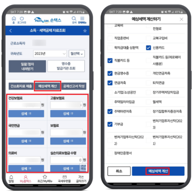 PC에서도 각 공제 항목을 조회하고 '세금 예상액 계산'을 클릭하여 동일한 작업을 수행할 수 있습니다.